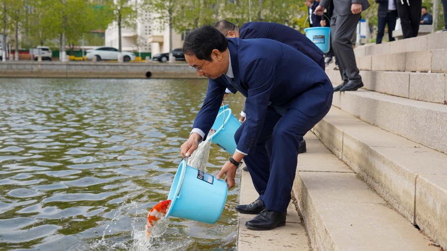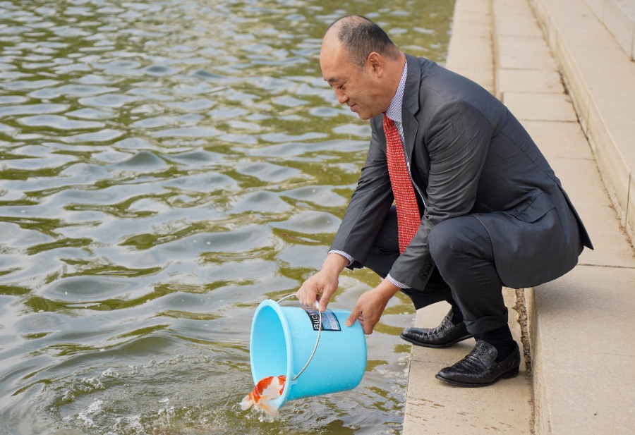辛軍董事長、徐榮哲副總裁、于光輝校長、盛國軍書記等校領導及學生代表分別放養(yǎng)了錦鯉,為即將到來的校慶盛典添彩助力。