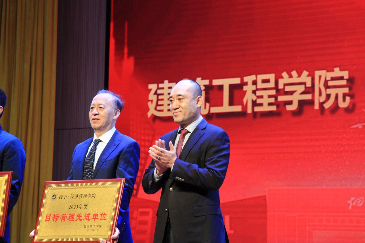 祥隆企業(yè)集團董事長、煙臺理工學院董事長辛軍及其他校領導為“目標管理先進單位”教學單位、“黨建及學生工作先進單位”等先進單位頒獎。