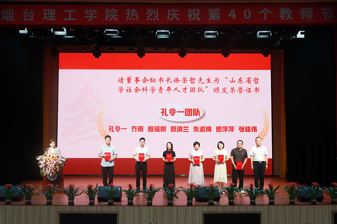 于光輝校長(zhǎng)為校級(jí)教學(xué)競(jìng)賽獲獎(jiǎng)教師代表頒發(fā)榮譽(yù)證書(shū);董事會(huì)秘書(shū)長(zhǎng)徐榮哲先生給“山東省哲學(xué)社會(huì)科學(xué)青年人才團(tuán)隊(duì)”頒發(fā)榮譽(yù)證書(shū);黨委書(shū)記盛國(guó)軍教授為“山東高校優(yōu)秀輔導(dǎo)員”頒發(fā)榮譽(yù)證書(shū)。