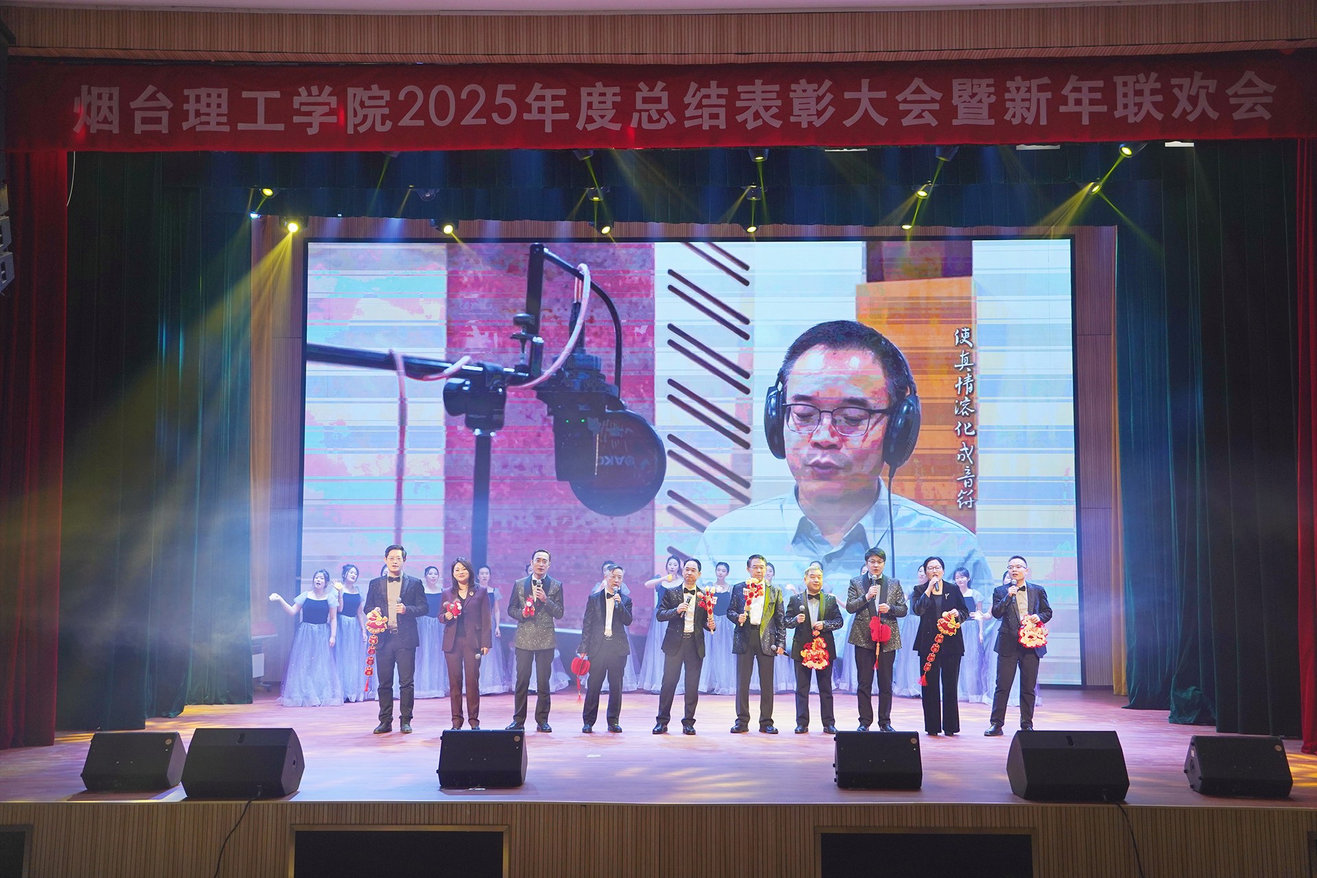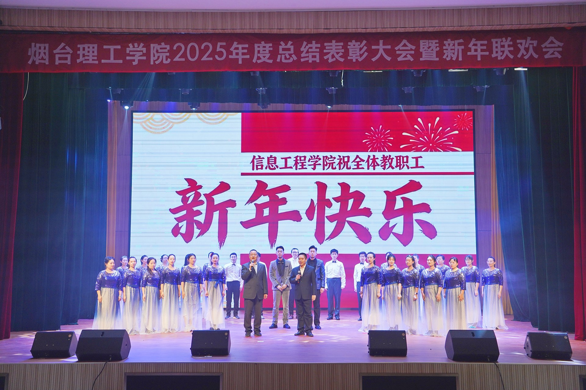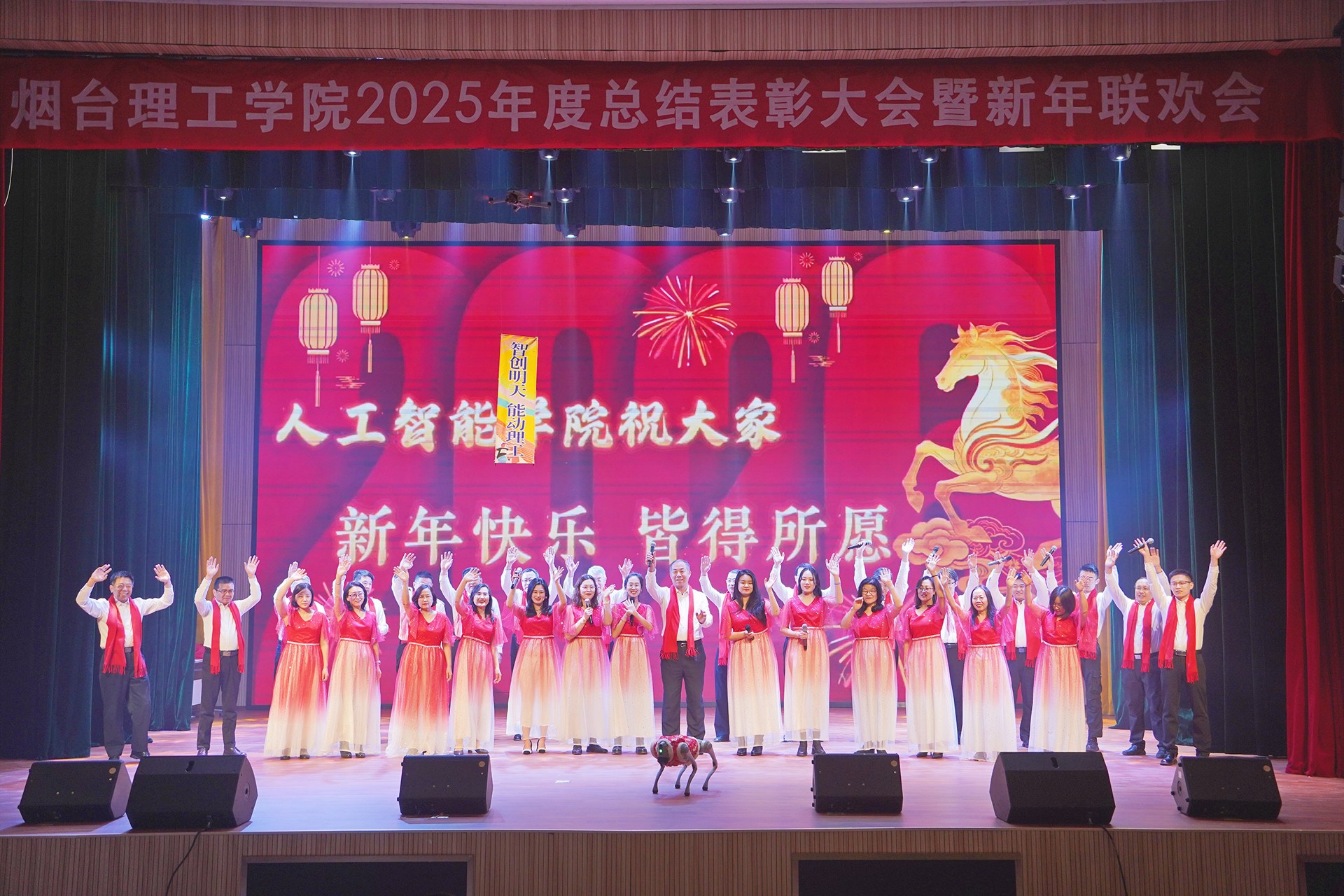 頒獎儀式后新年聯(lián)歡會正式拉開序幕。節(jié)目形式豐富、內(nèi)容精彩,展現(xiàn)了學(xué)校美育工作的豐碩成果和教職工多才多藝、積極向上的精神風貌。最后,全體人員齊聲高唱《歌唱祖國》,激昂的歌聲響徹全場,傳遞出對祖國的無限熱愛與對學(xué)校未來的美好期許。